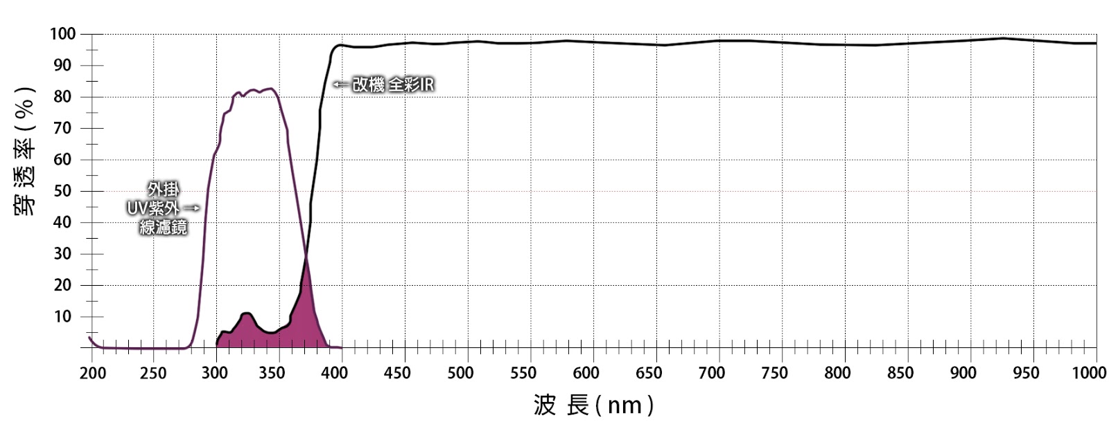 粉紫色区块代表IR3滤镜可以允许通过的波常范围及其穿透率。